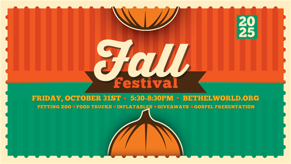 Join us on the 31st for a great time for you and your whole family! We'll have carnival rides, a petting zoo, inflatables, food trucks, a gospel presentation, and more! The Fall Festival will be held in the front parking lot as well as inside the lobby. Bethel family, remember this is an important outreach opportunity. Please support by inviting those around you, donating candy (drop off in the lobby), and volunteering. You can sign up to volunteer